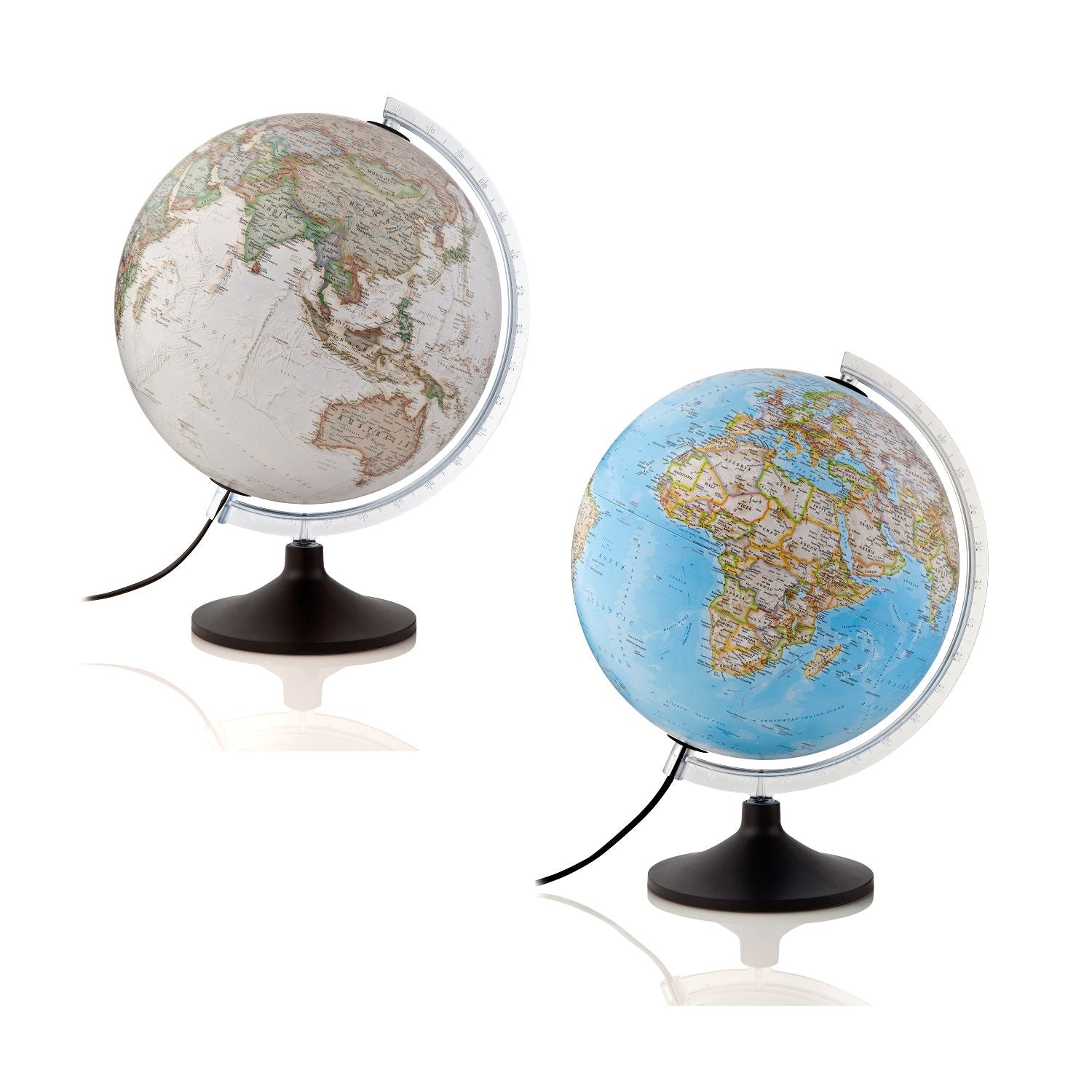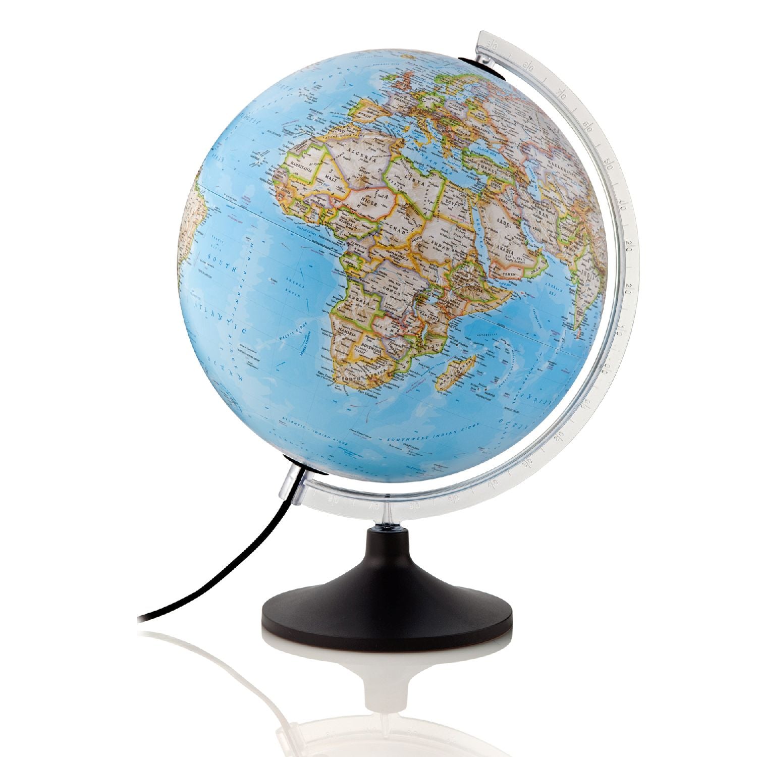 Dieser beleuchtete Leuchtglobus von National Geographic zeichnet sich durch Stil und modernes Design aus.Die Kugel mit der durch die National Geographic Maps Division erstellten Kartographie "Classic" oder "Executive" hat einem Durchmesser von 30 cm. Das Kartenbild ist im Wesentlichen politisch, physische Informationen sind durch Schattierungen angedeutet. Über 2.000 geografische Namen sind auf diesem Leuchtglobus verzeichnet.