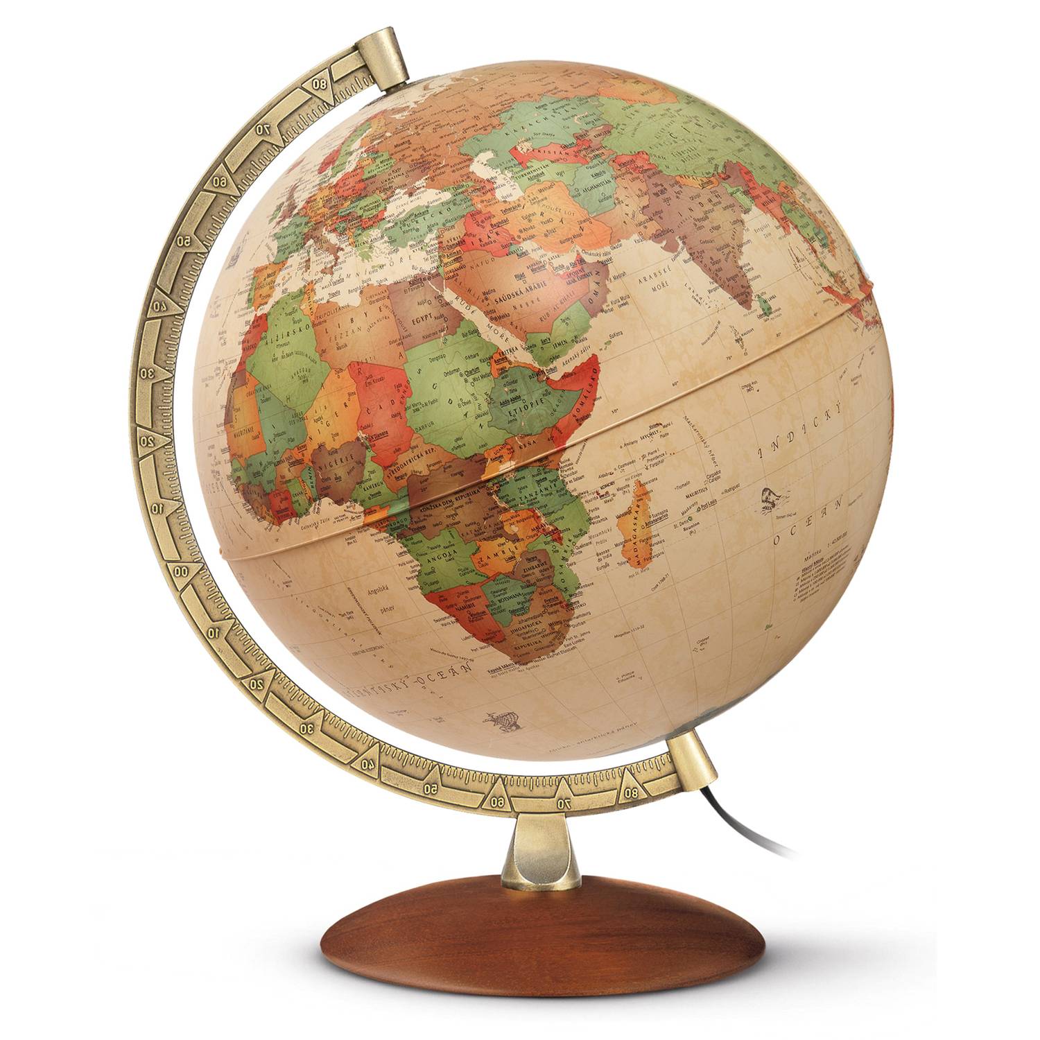 Der Globus stellt die Erde im Stil antiker Karten dar. Damals wurden die Ozeane und Meere noch nicht wie heute üblich in Blau dargestellt, sondern eher in einem Ocker- oder Beigeton. Somit wird diese Art von Globus ein dekoratives Wohnaccessore. Die verwendeten Natur- und Erdfarben erzeugen ein besonders warmes und angenehmes Licht. Trotz des antiken Stils des Globus, ist das Kartenbild politisch und kartografisch auf dem aktuellen Stand.